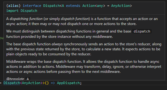 dispatch는 useDispatch의 return 값이다. 근데 docs를 아무리 찾아봐도 dispatch가 어떻게 동작하는지 전혀 모르겠어서,