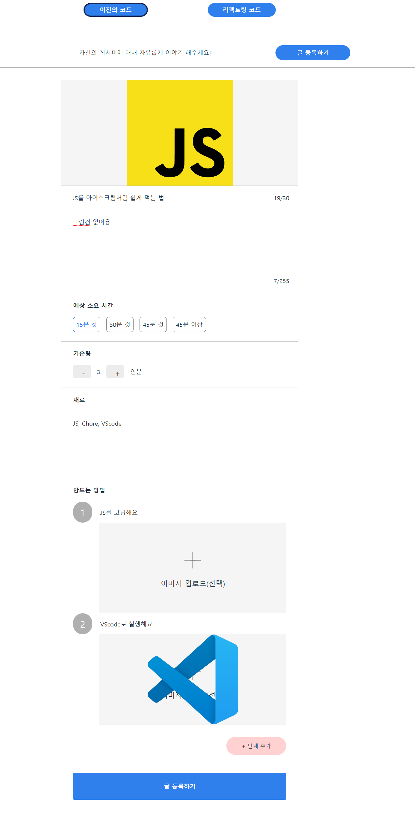 1. 레시피 게시글 작성이니 만큼 제목, 간단소개, 소요시간, 기준량, 재료, 만드는 단계를 제공해야한다.